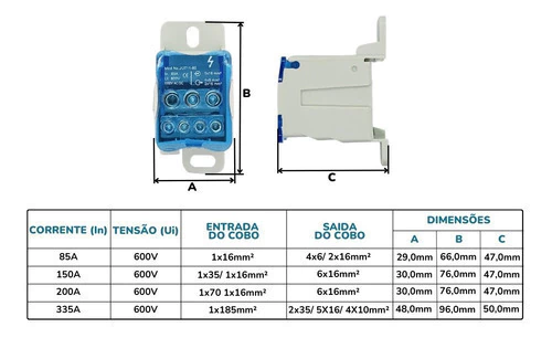 Os Blocos de Distribuição são produzidos em termoplástico autoextinguível, ideias para a Derivação dos circuitos de alimentação nos quadros elétricos, em diferentes seções de cabos. Disponível na versão Monopolar, permite aplicação na corrente de 160A com instalação por encaixe em Trilho DIN ou com Parafusos na placa de montagem. Possuem IP20 e estão de acordo com a Norma IEC60947-7-1