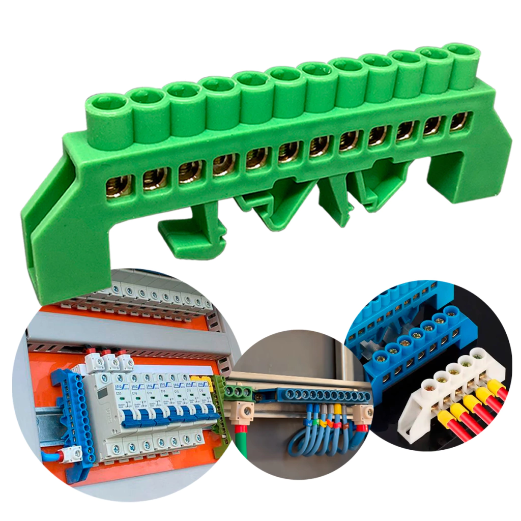 o 1un | Barramento Terra 12 Furos (12 Polos) - Fixação Din - Verde