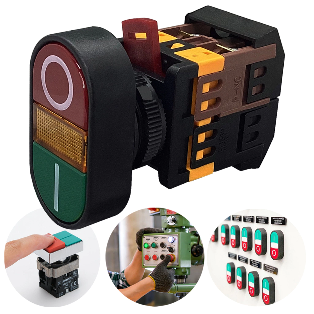 O Botão duplo Com iluminação funciona como um comando de intertravamento elétrico, onde o botão Verde, geralmente, é utilizado para iniciar uma operação e o Vermelho para desliga-la. Ele possui um led que identifica quando o equipamento está em utilização ou não.