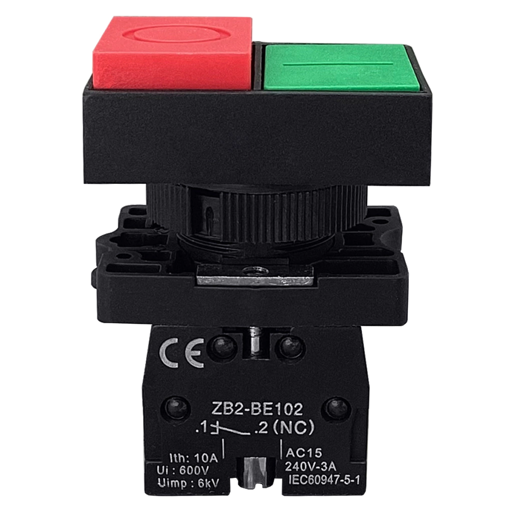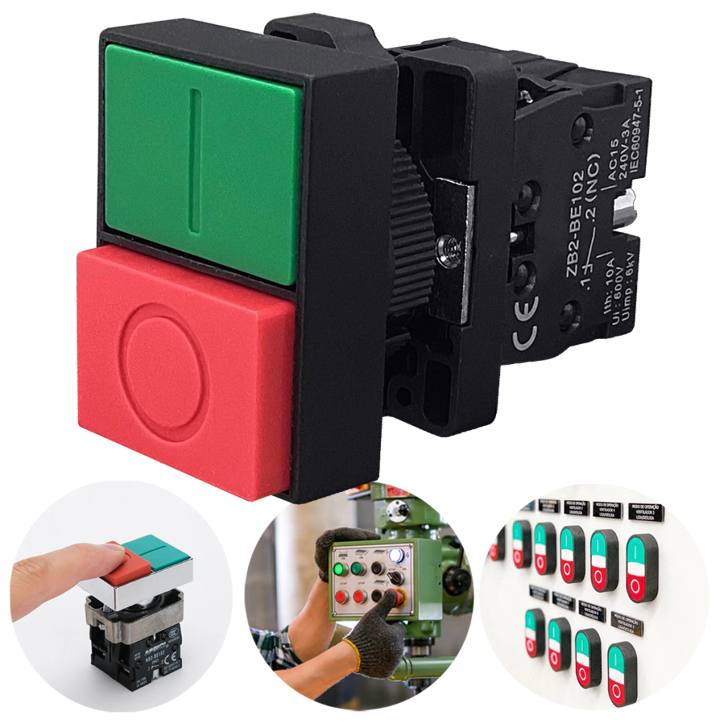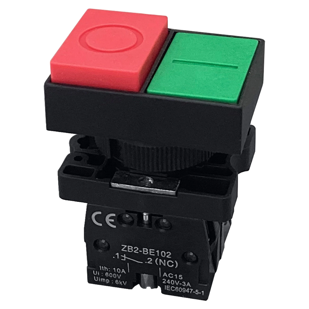 O Botão duplo Sem iluminação funciona como um comando de intertravamento elétrico, onde o botão Verde, geralmente, é utilizado para iniciar uma operação e o Vermelho para desliga-la.