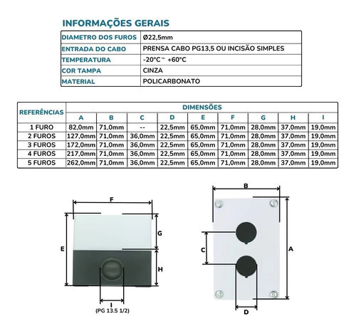 Indicadas para montagem de botões, sinaleiros, buzzers, Chaves seletoras, e demais produtos com padrão 22mm. Possui seu corpo injetado em poliamida, resultando em um ótimo acabamento, resistência e durabilidade. E também possui uma furação existente para passagem de cabos e mais uma furação pré formada, e ambas utilizam prénsa cabo PG13,5.