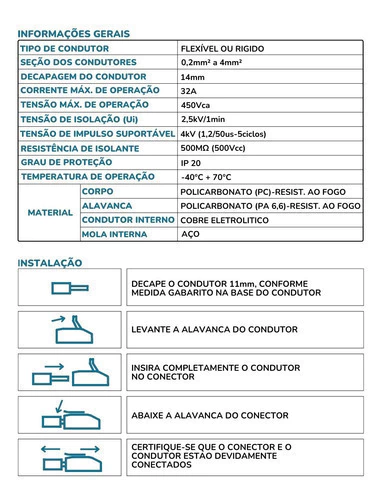 Os Conectores Alavanca é um sistema de Emenda de fios e cabos com conexão a mola proporcionando constante préssão de Contato, excelente condutividade e insignificante perda de tensão. Ocupam menos espaço quando comparado com as Emendas feitas com fitas isolantes convencionais, oferecendo melhor organização dos fios, eliminado o risco de desconexão acidental e mau contato. As conexões podem ser feitas e refeitas quantas vezes forem necessárias, reutilizando o produto substituído em outras instalações. Produzido com material auto extinguível resistente a altas temperaturas, possui um ponto de teste para medições da tensão e para melhor operação a abertura da Alavanca está localizada do mesmo lado da introdução da fiação.