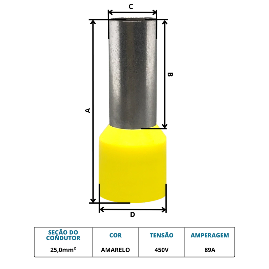 100un - Terminal Pré-isolado Tubular Ilhós Simples 25mm - Comp. do Tubo 18mm - Amarelo