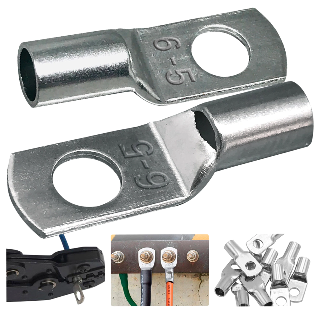 Os terminais de compressão são fabricados em cobre eletrolítico com acabamento estanhado. Utilizados na conexão de cabos em equipamentos, barramentos, disjuntores, contatores e na conexão de cabos para aterramento.