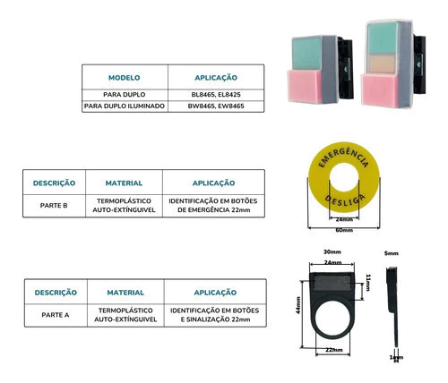 As Plaquetas Identificadoras de painel, são utilizadas para tornar mais simples a identificação das finalidades que determinado botão terá. Este porta etiquetas é adequado para botões com furo de 22mm.