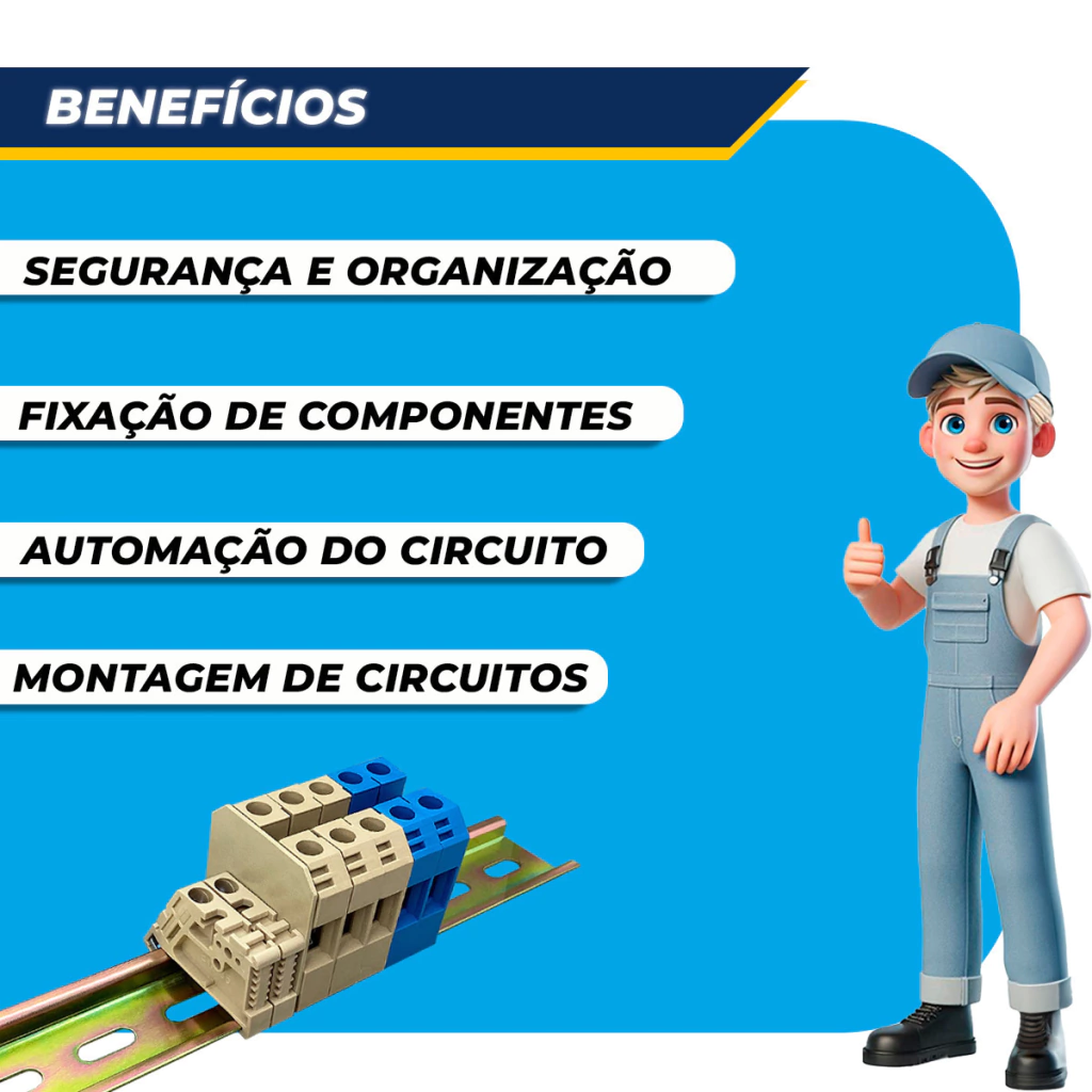 o O Trilho din é utilizado para Fixação de componentes elétricos e instalações, principalmente em painéis elétricos. Esse Trilho oferece durabilidade e resistência à corrosão, pois o mesmo é bicromatizado.